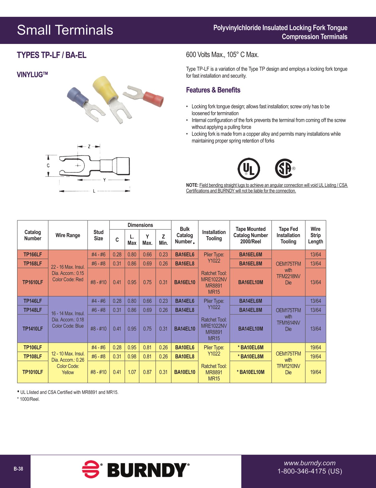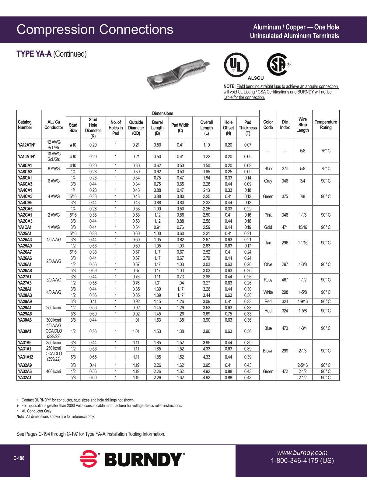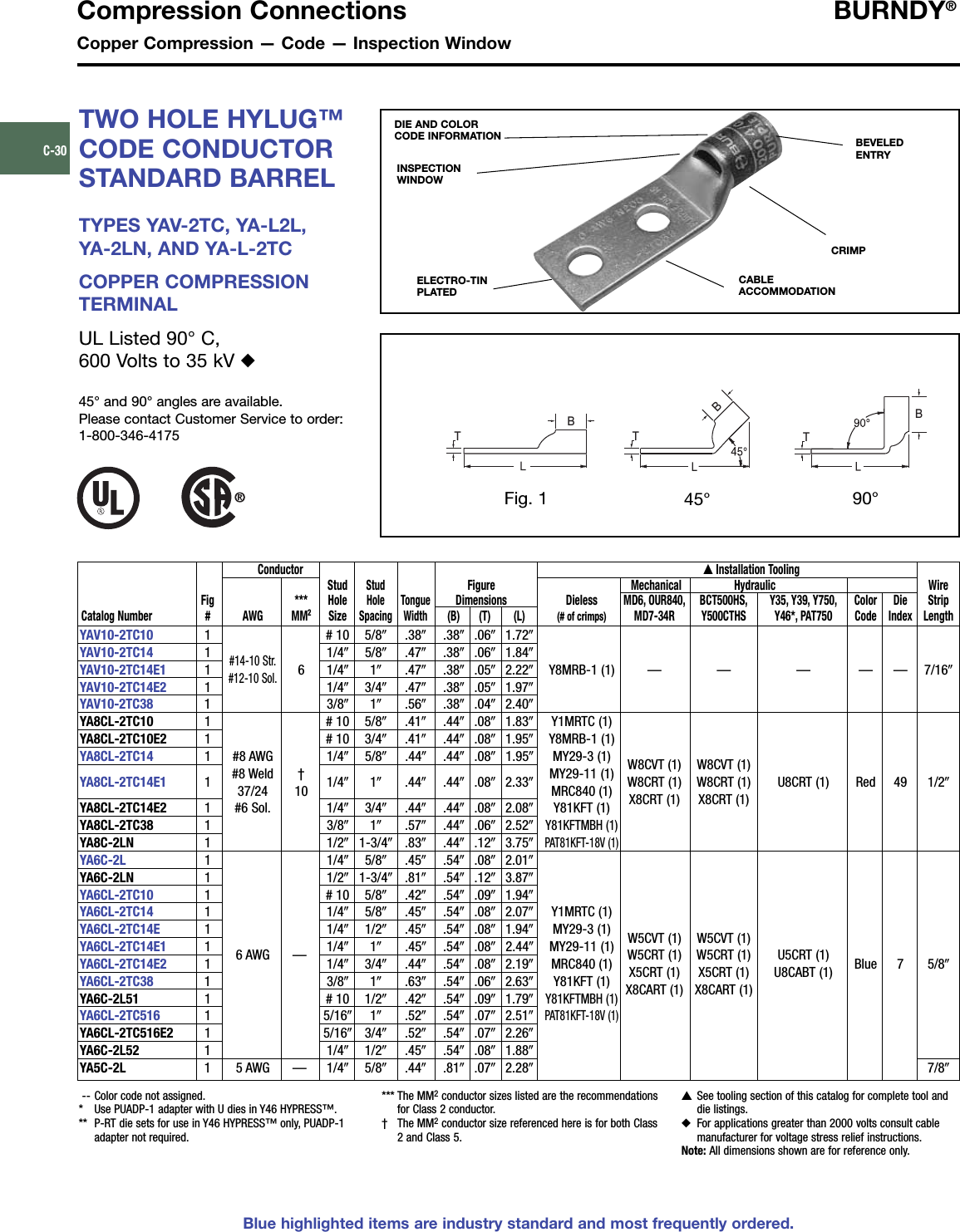 Burndy Solderless Terminals YAV 2TC, YA L2L, 2LN, L 2TC Catalog Page