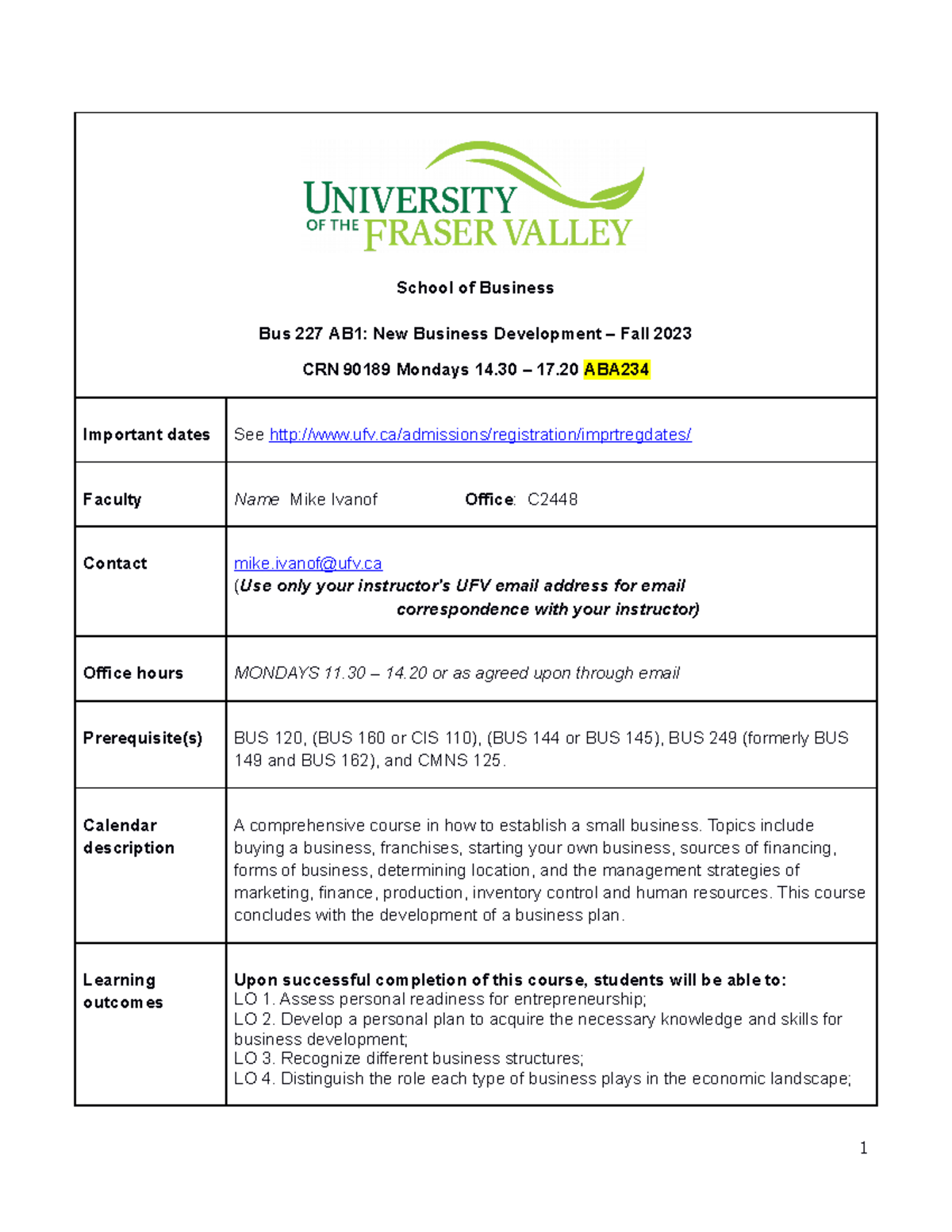 BUS 227 Course Outline AB1 FALL 2023 School of Business Bus 227 AB1