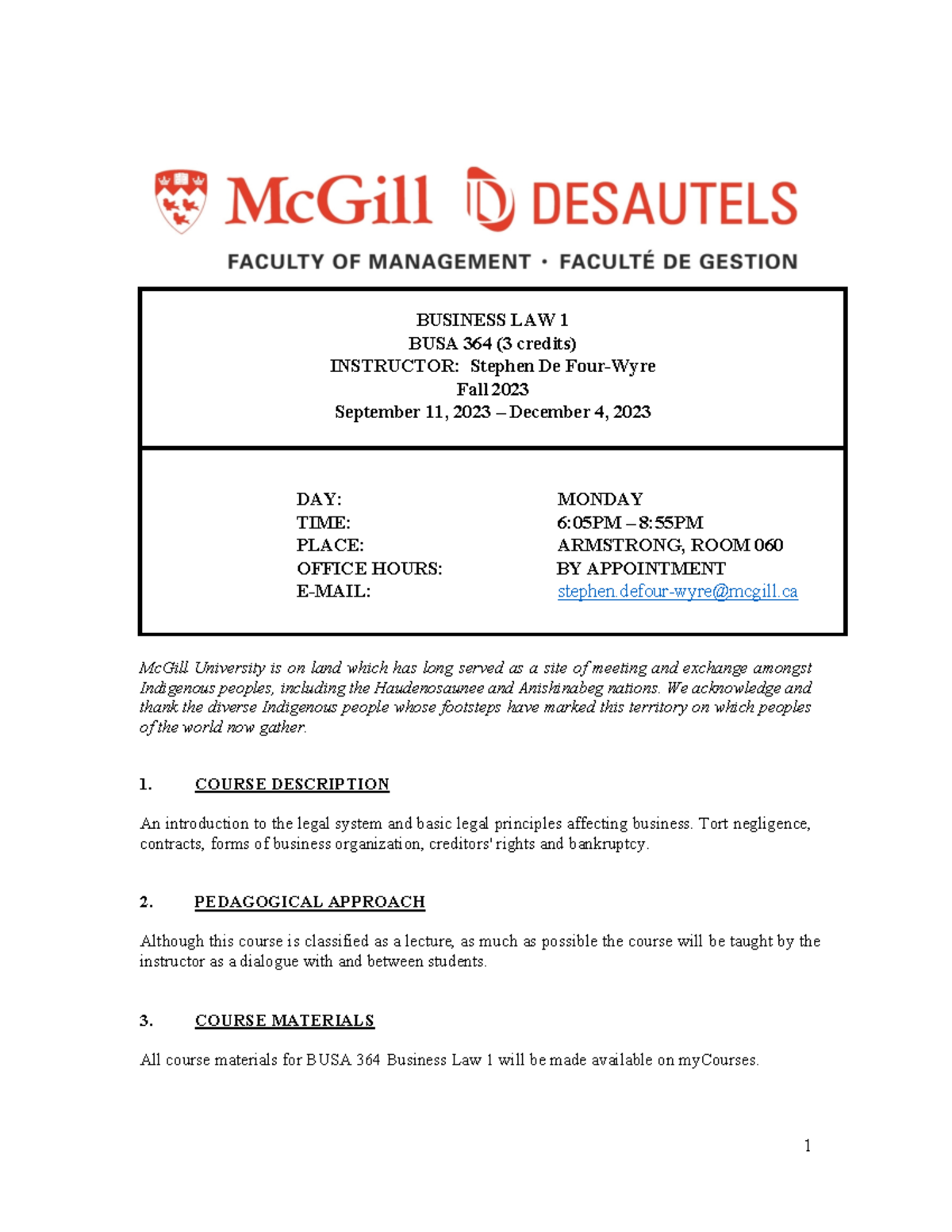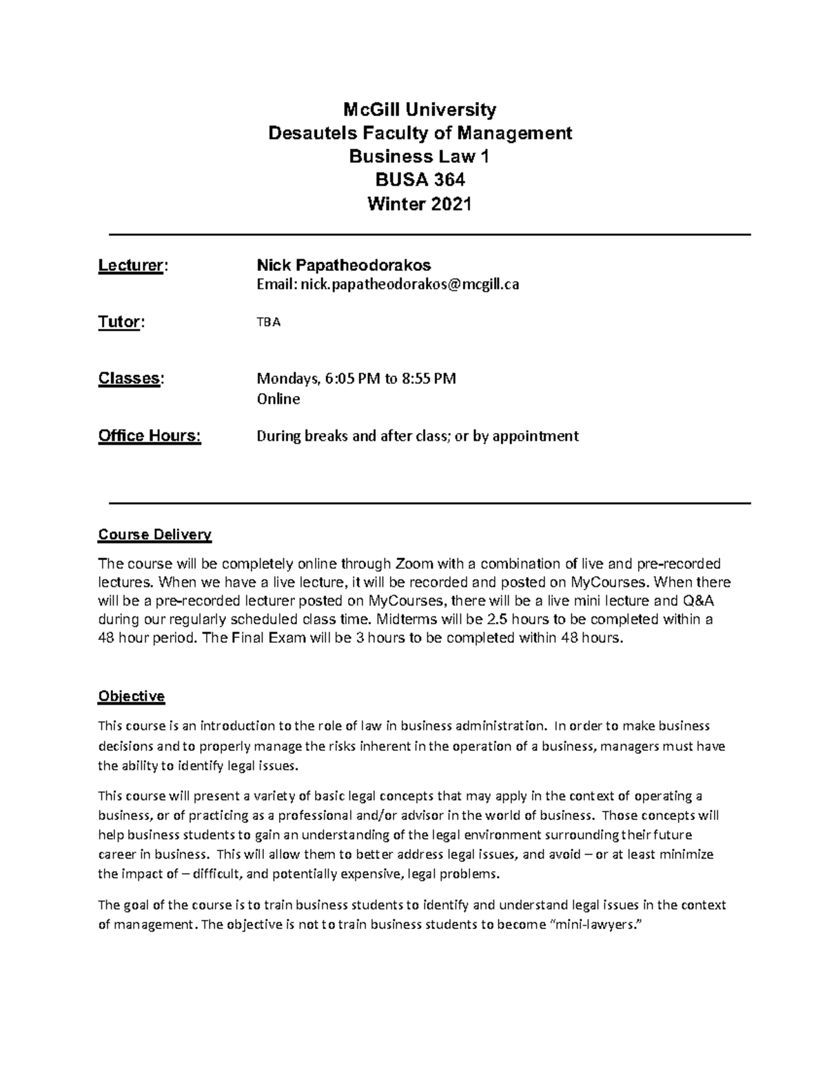 BUSA 364 Winter 2021 Syllabus McGill University Desautels Faculty