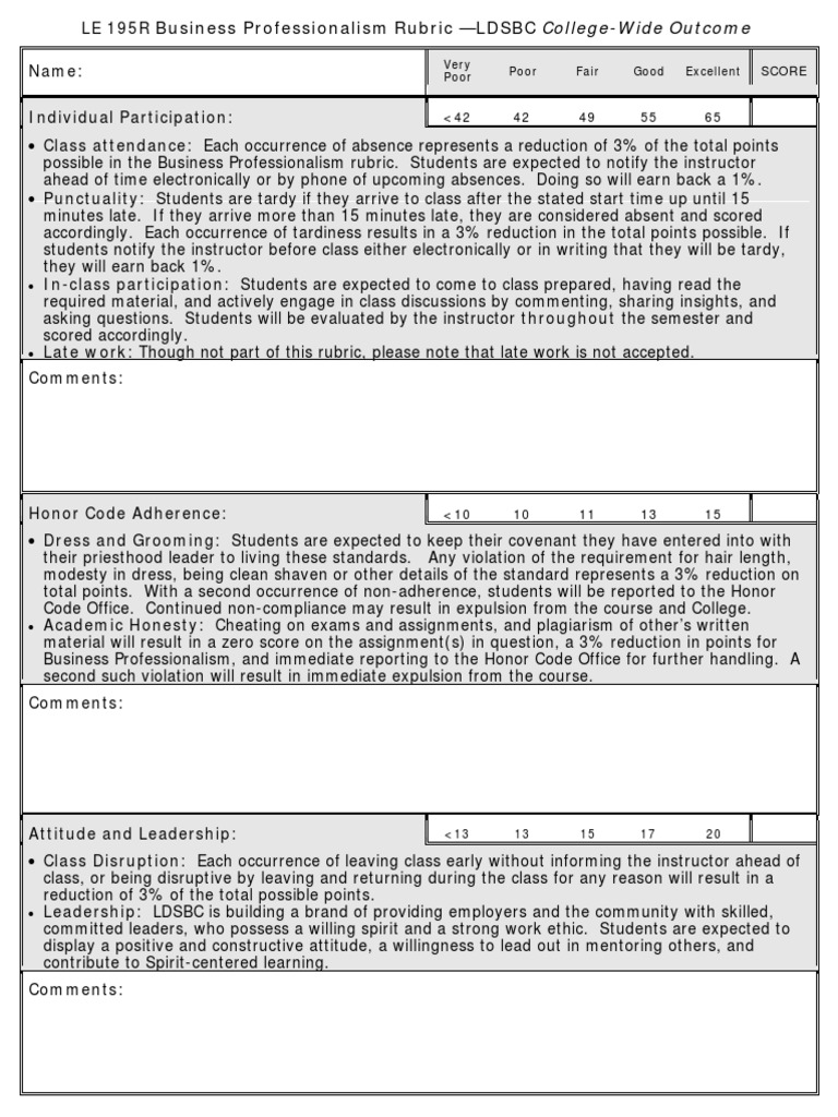 Business Professionalism Rubric LDSBC PDF Teaching Pedagogy