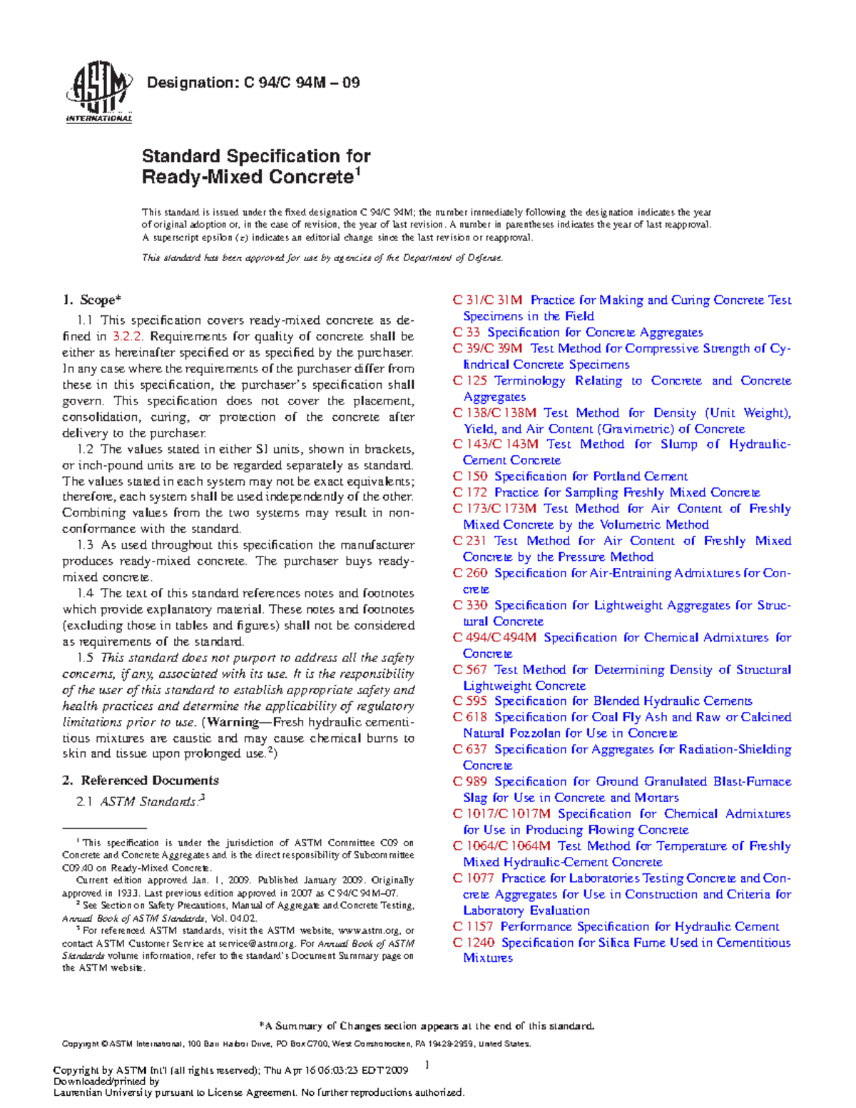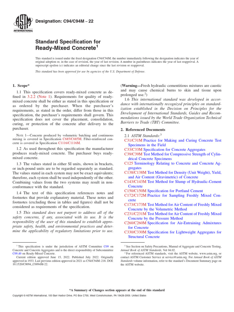 ASTM C 94/C 94M—09 Specification for ReadyMixed Concrete (PDF Download)