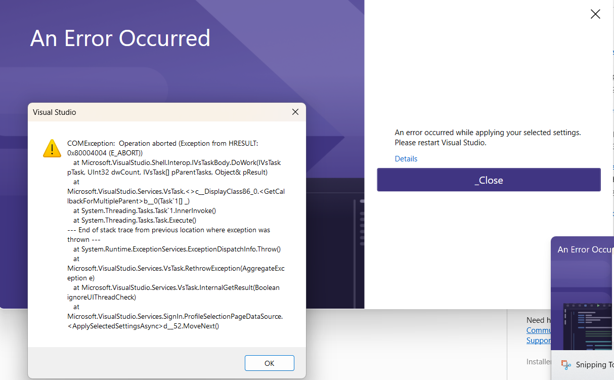 Visual Studio not opening after error occurred applying settings on