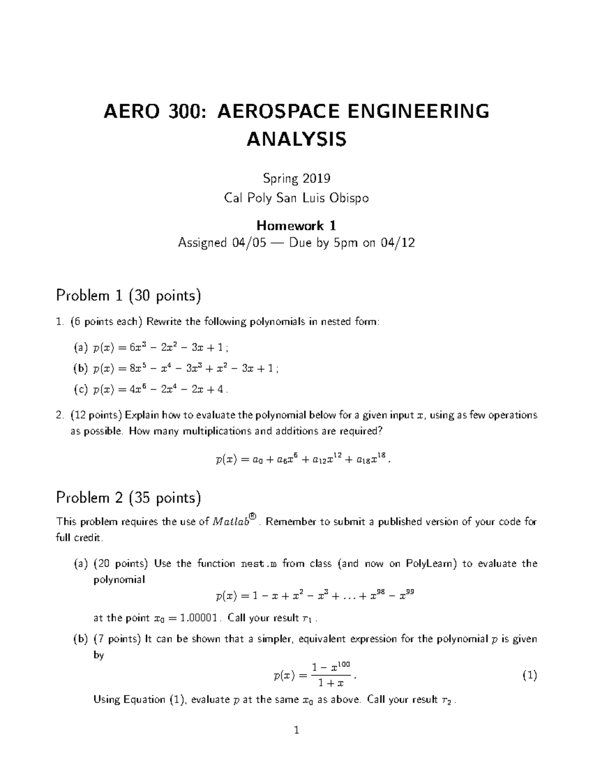 Homework 1 note AERO 300 AEROSPACE ENGINEERING ANALYSIS Spring