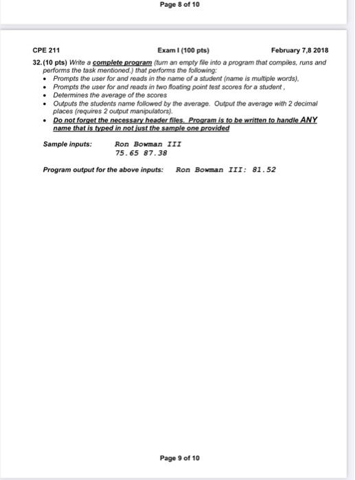 Solved Page 8 of 10 CPE 211 Exam I (100 pts) February 7,8