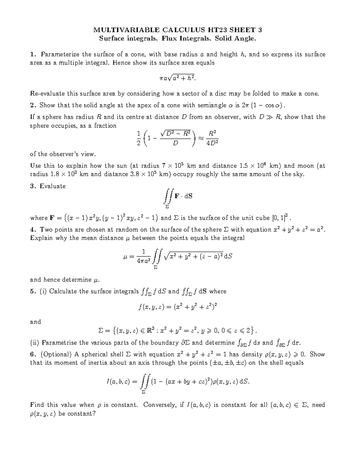 Sheet 3 MULTIVARIABLE CALCULUS HT23 SHEET 3 Surface integrals. Flux