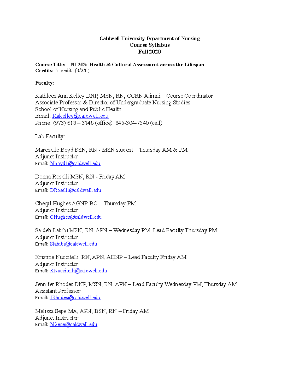 NU303 Syllabus Caldwell University Department of Nursing Course