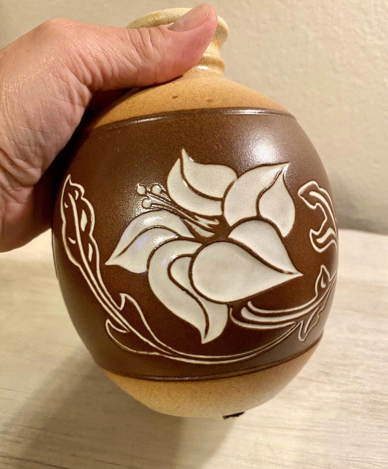 Vintage California Pottery Two Tone Vase with Flower Detail For Sale at