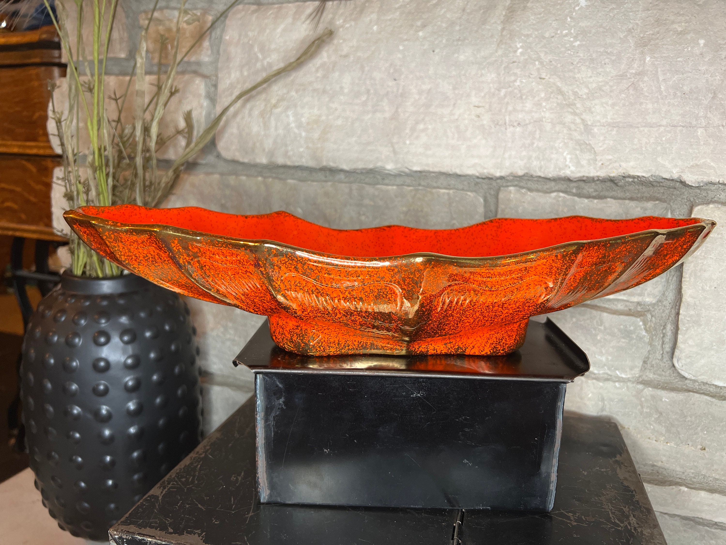California Pottery Orange & Gold Dish, Oblong Unique, Scalloped Edges