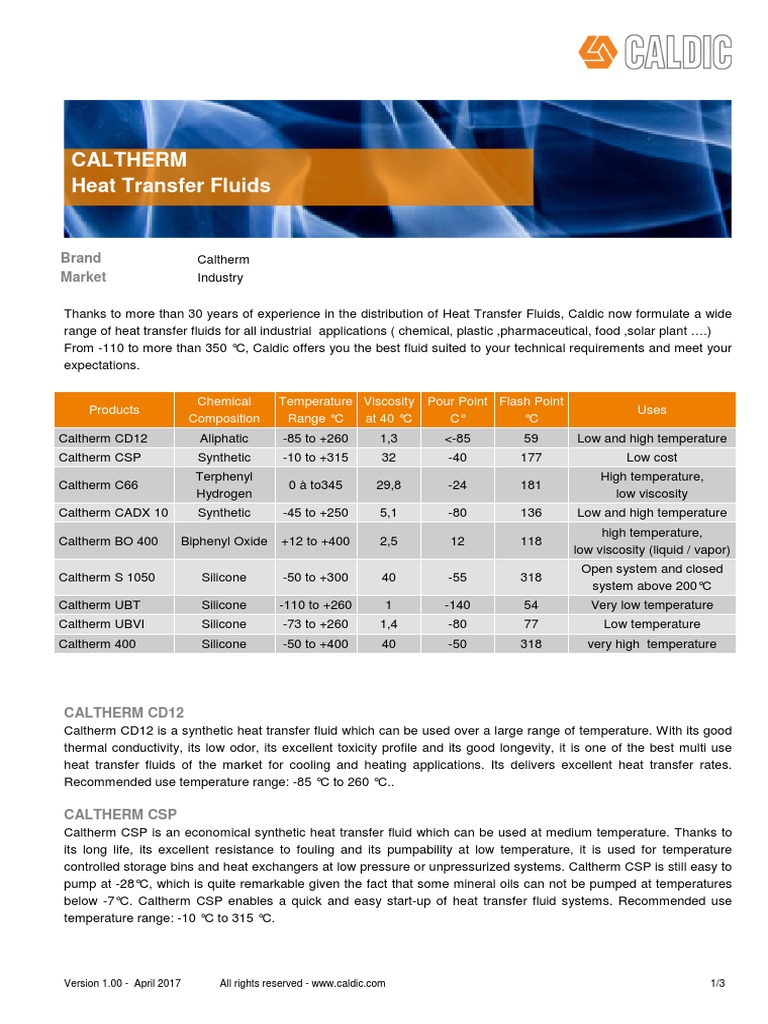Caltherm Heat Transfer Fluids General Sheet PDF Coolant Cryogenics