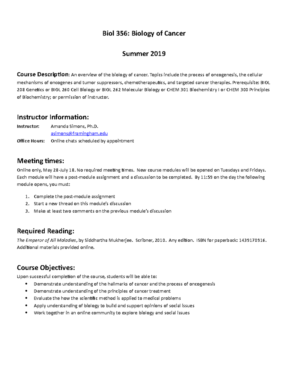 Bio 356 Cancer Biology Syllabus Biol 356 Biology of Cancer Summer