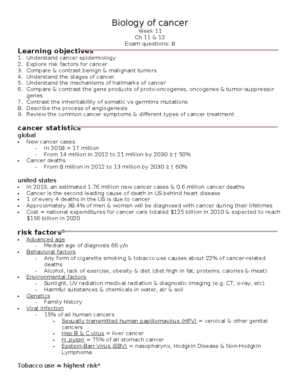 Cancer Biology (lectures 1 & 2) 20202021 Cancer Biology (lectures 1
