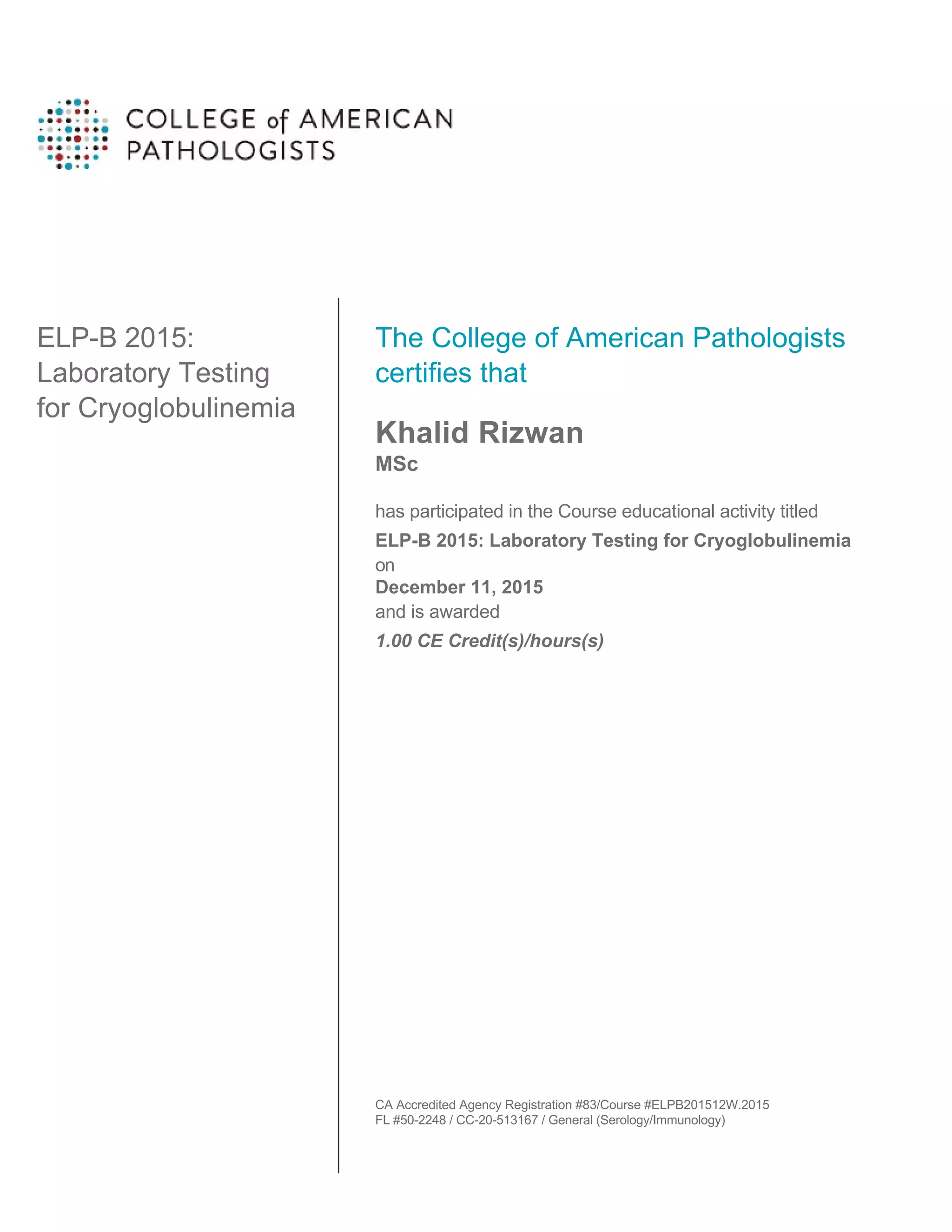 CAP CERTIFIES ELPB 2015 LABORATORY TESTING FOR CRYOGLOBULINEMIA.PDF