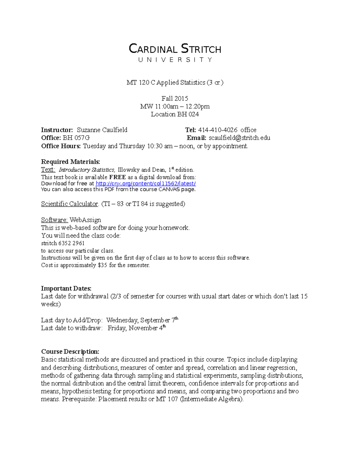 Statistcis Syllabusmt120fall2016sxc CARDINAL STRITCH U N I V E R