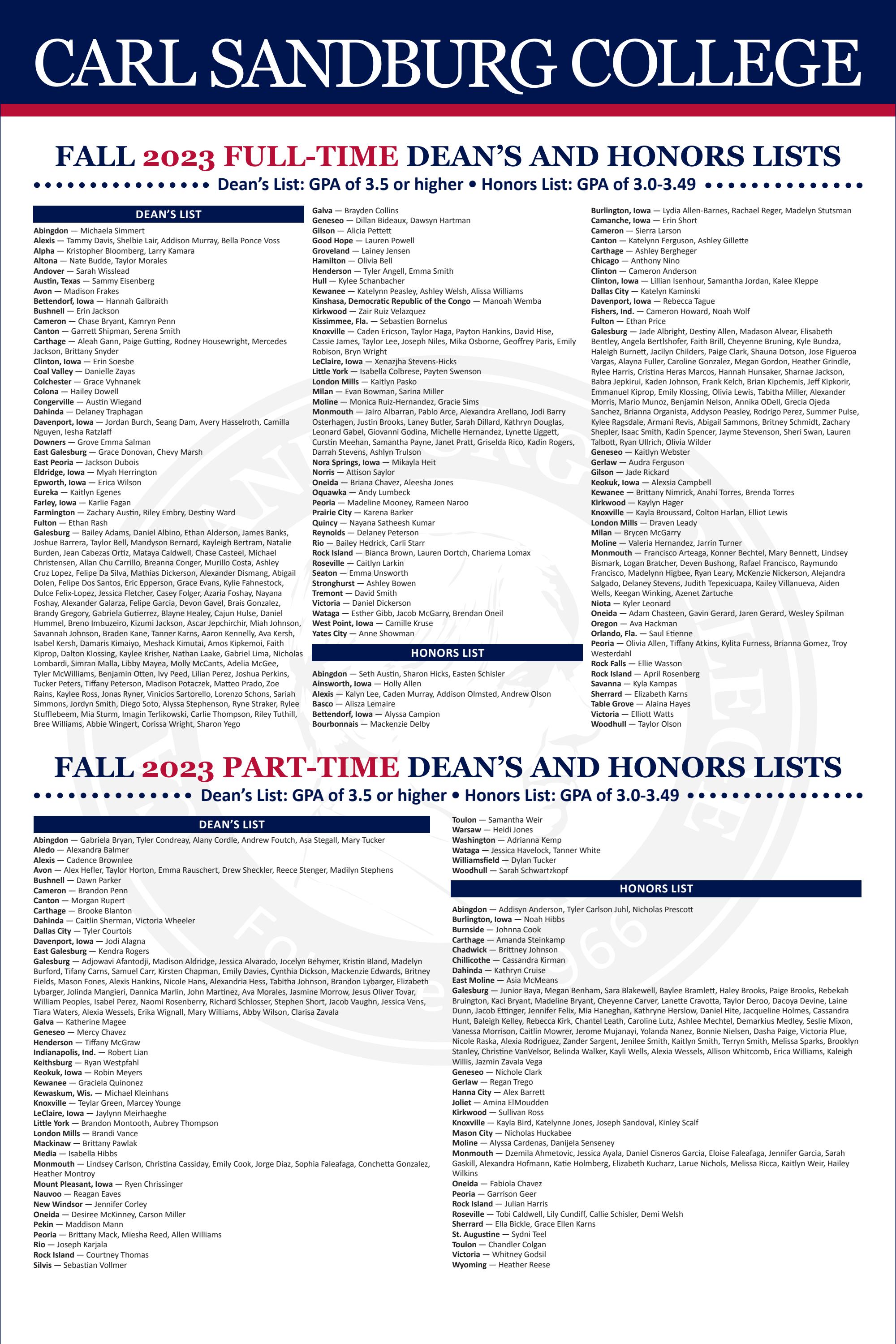 Carl Sandburg College 2023 Fall Semester Dean’s, Honors Lists by Carl