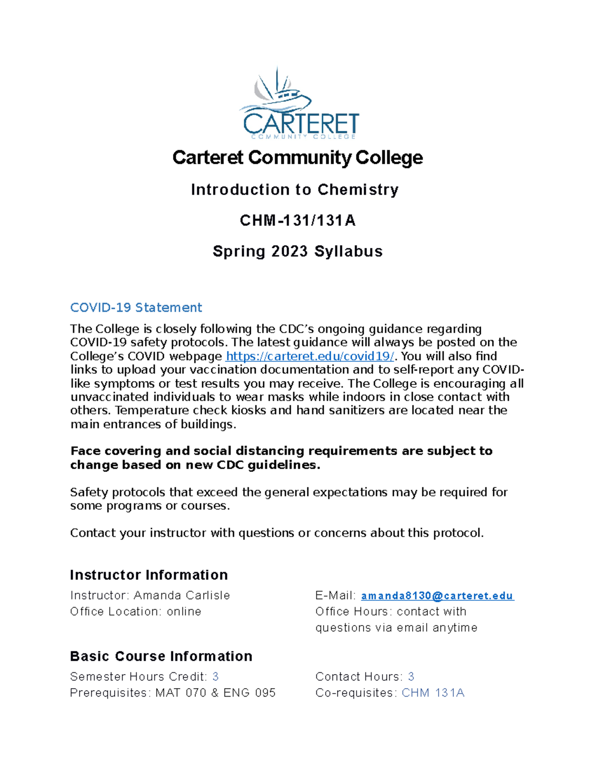 CHM 131131 A Spring 2023 Carteret Community College Introduction to