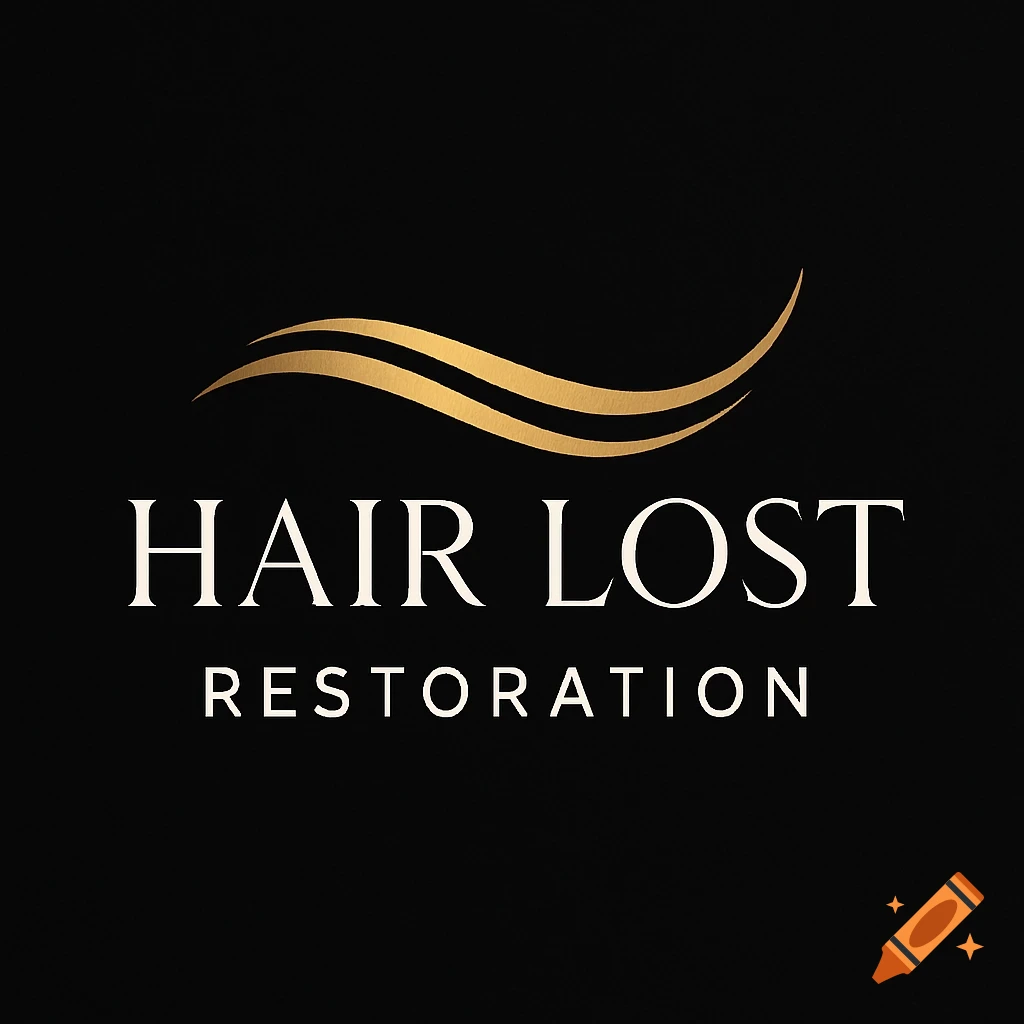 Logo for 'Hair Lost Restoration' with gold waves and white text on a