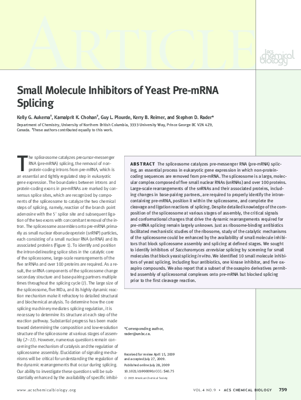 (PDF) Small Molecule Inhibitors of Yeast PremRNA Splicing