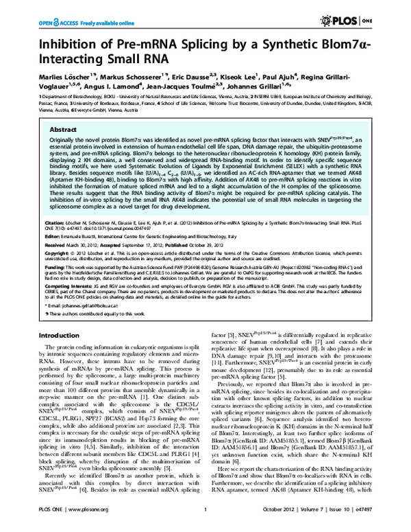 (PDF) Inhibition of PremRNA Splicing by a Synthetic Blom7αInteracting