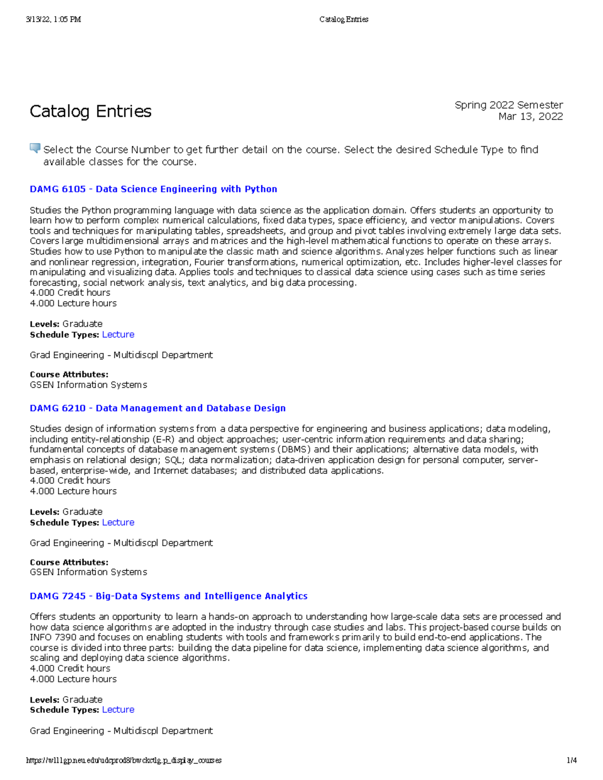DAMG Course Catalog Catalog Entries Spring 2022 Semester Mar 13, 2022