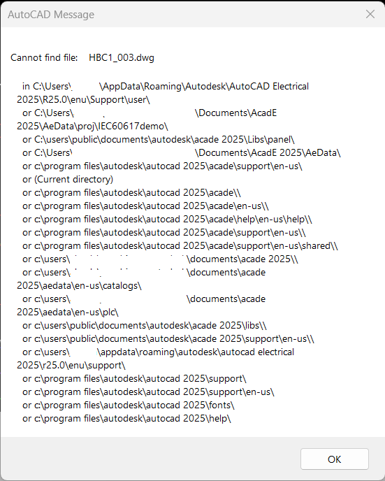 "Unable to find drawing WD_M.dwg" while working in AutoCAD Electrical