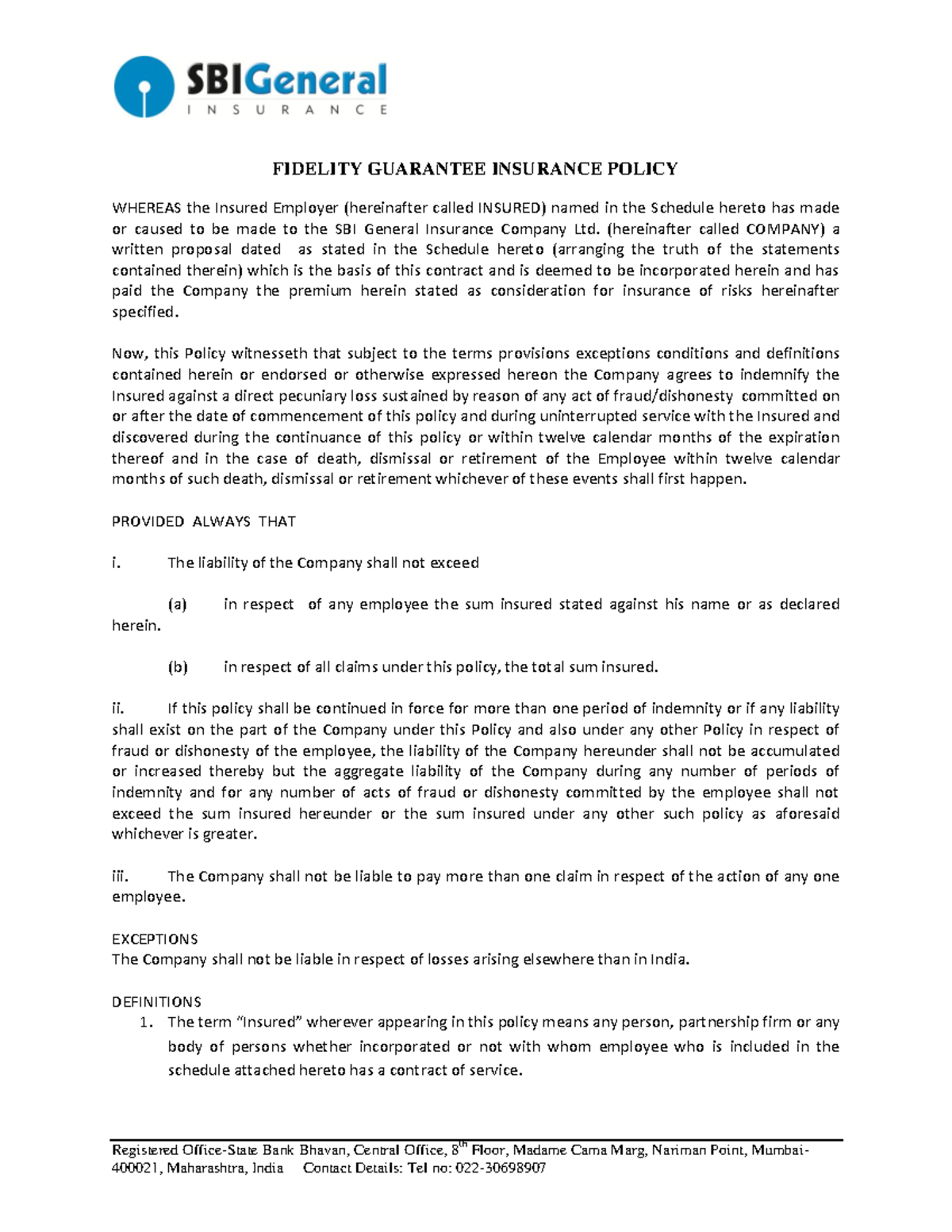 65 Fidelity Guarentee Insurance Policy GEN565 Registered OfficeState