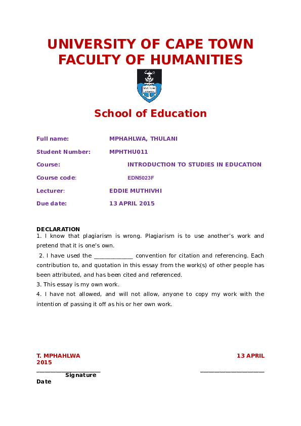 (DOC) UNIVERSITY OF CAPE TOWN FACULTY OF HUMANITIES School of Education