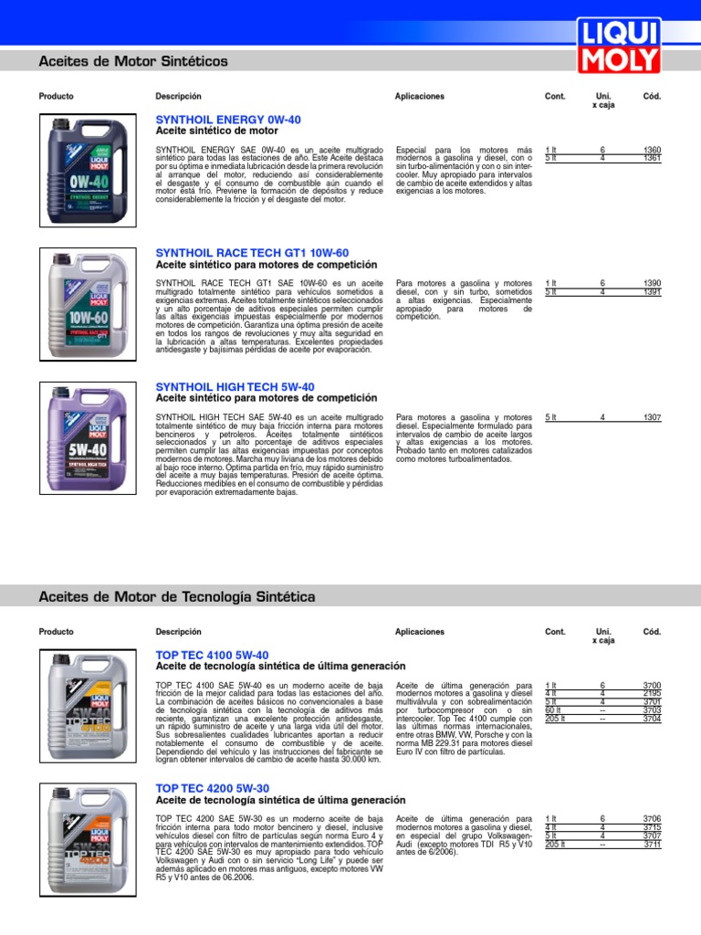 Catalogo Aceites Liqui Moly Lubricante Gasolina