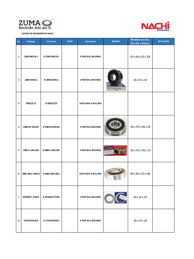 Listado de Rodamientos Nachi No. Catalogo Cod. Zuma Koyo Descripcion