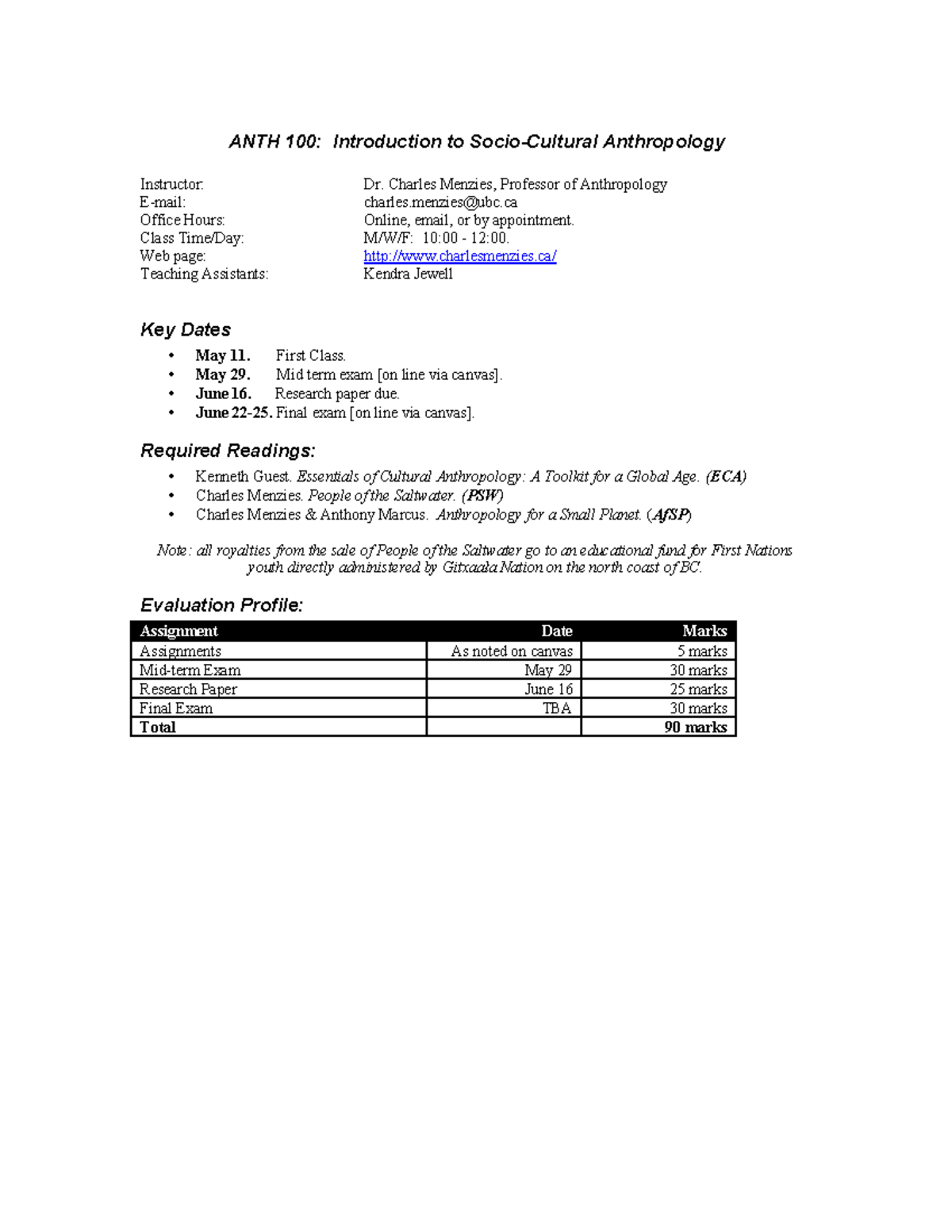 ANTH100outline2020 ANTH 100 Introduction to SocioCultural