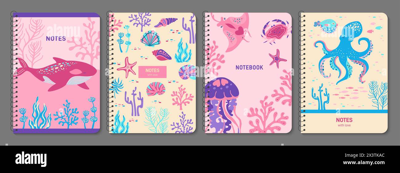 Ocean sea animals notebook and notepad cover set. Hand drawn marine