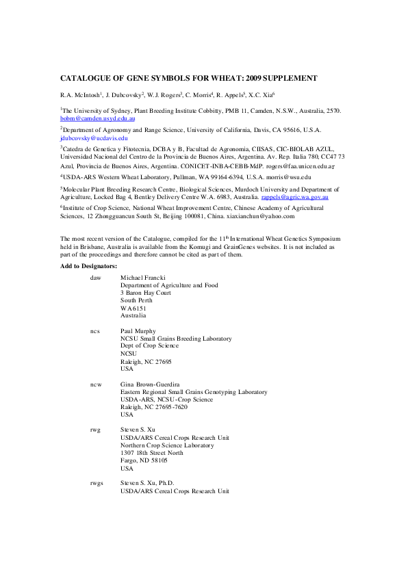 (PDF) CATALOGUE OF GENE SYMBOLS FOR WHEAT 2007 Supplement