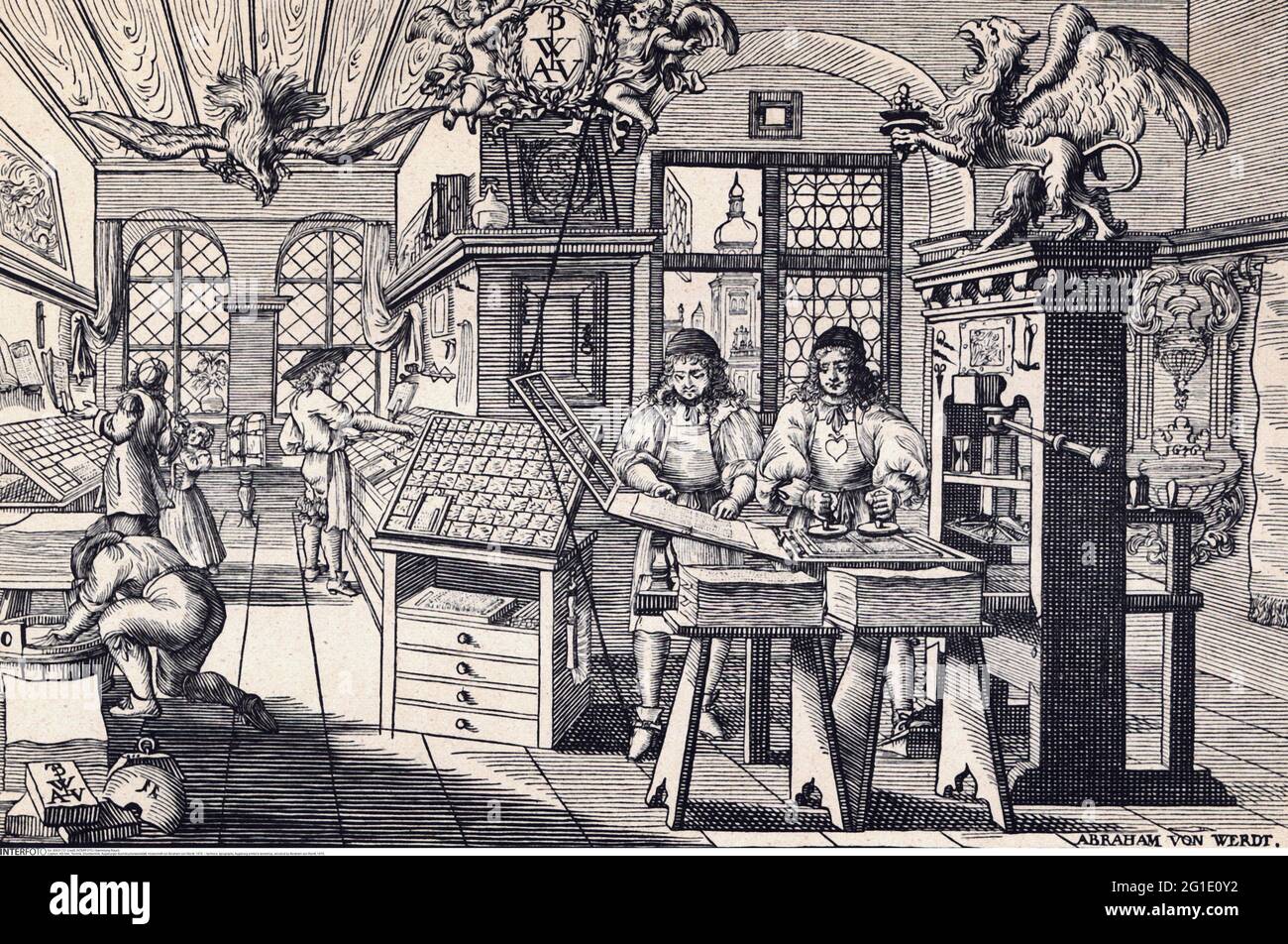 Printing office, Typesetter, Typesetting, Printing press, early 18th