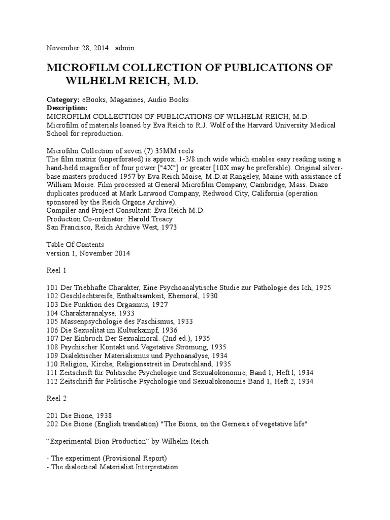 Microfilm Collection of Publications of Wilhelm Reich, M.D. Category