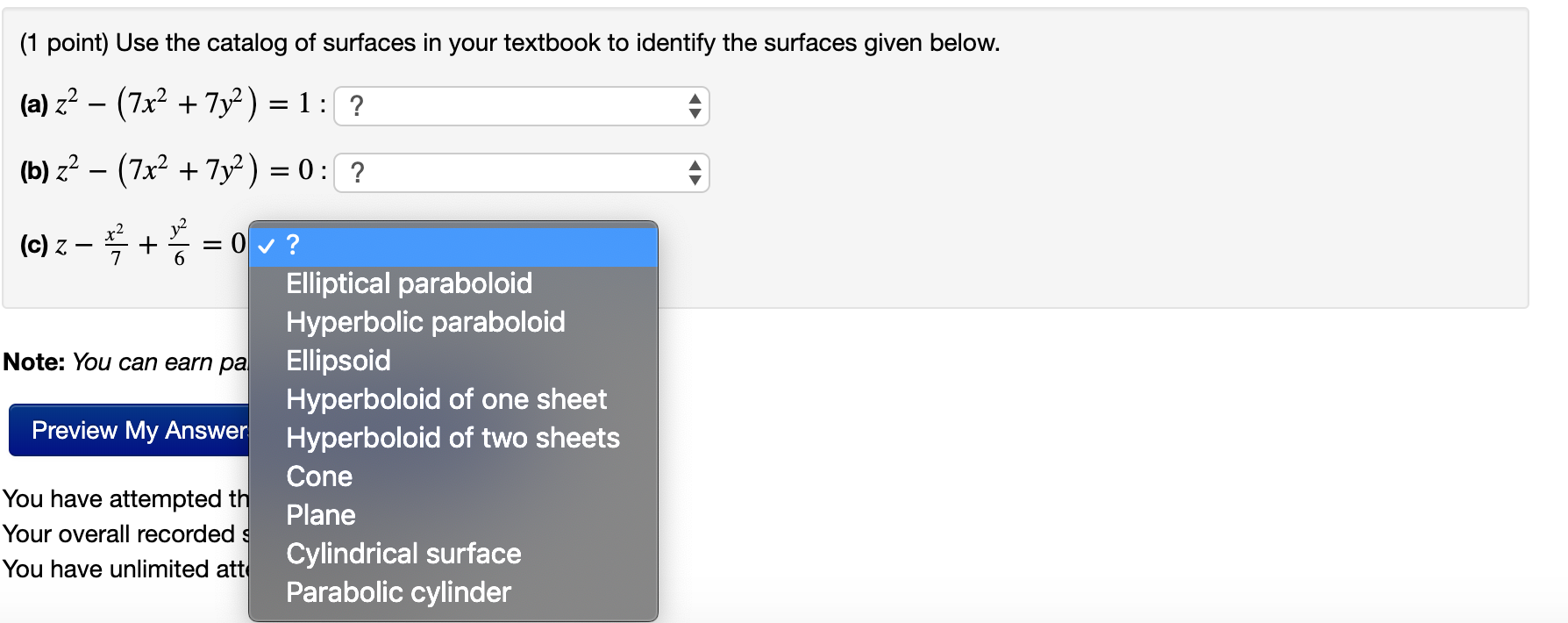 Solved (1 point) Use the catalog of surfaces in your