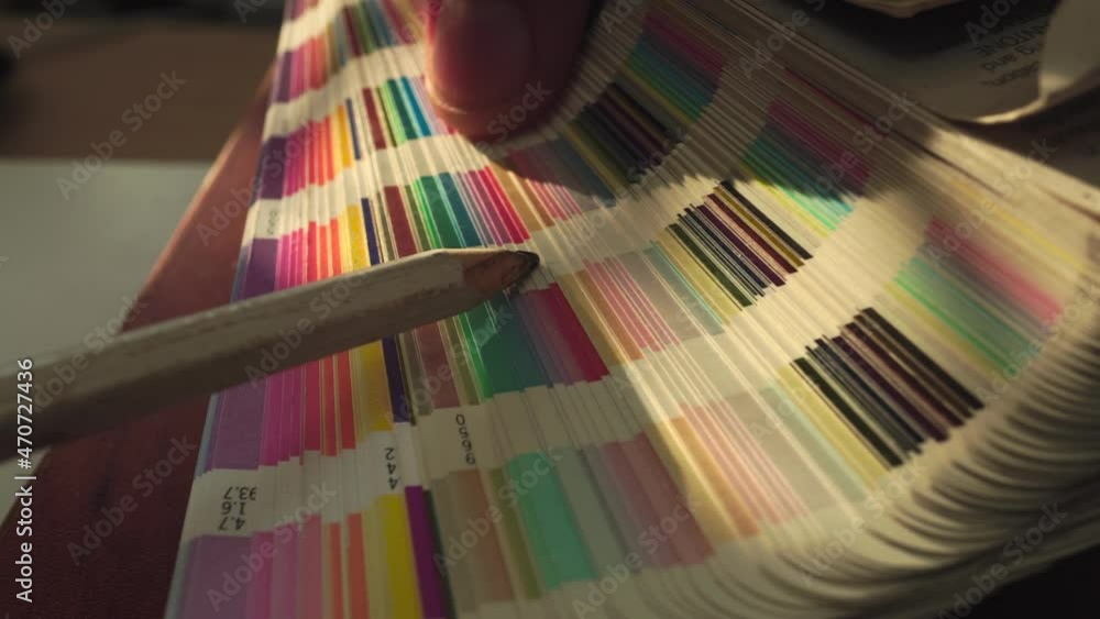 Macro video f a graphic designer choosing colors from a color book
