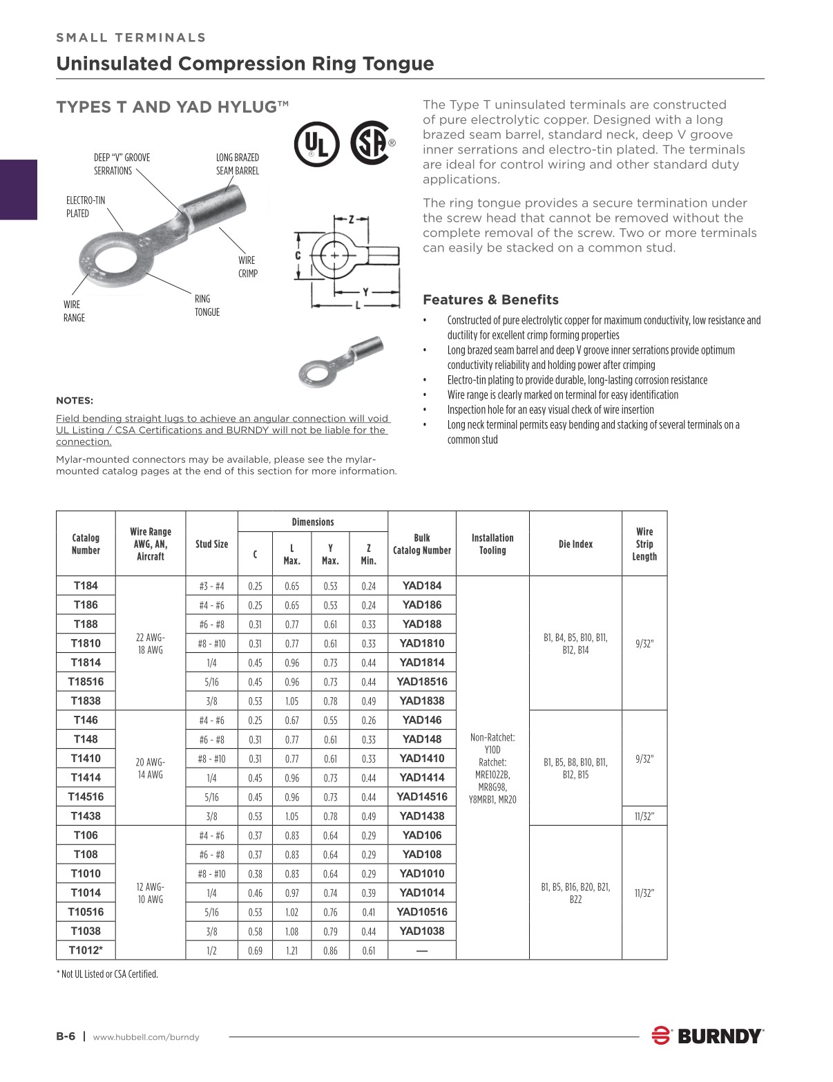 Burndy T184, T186, T188, T1810, T1814 dimensions
