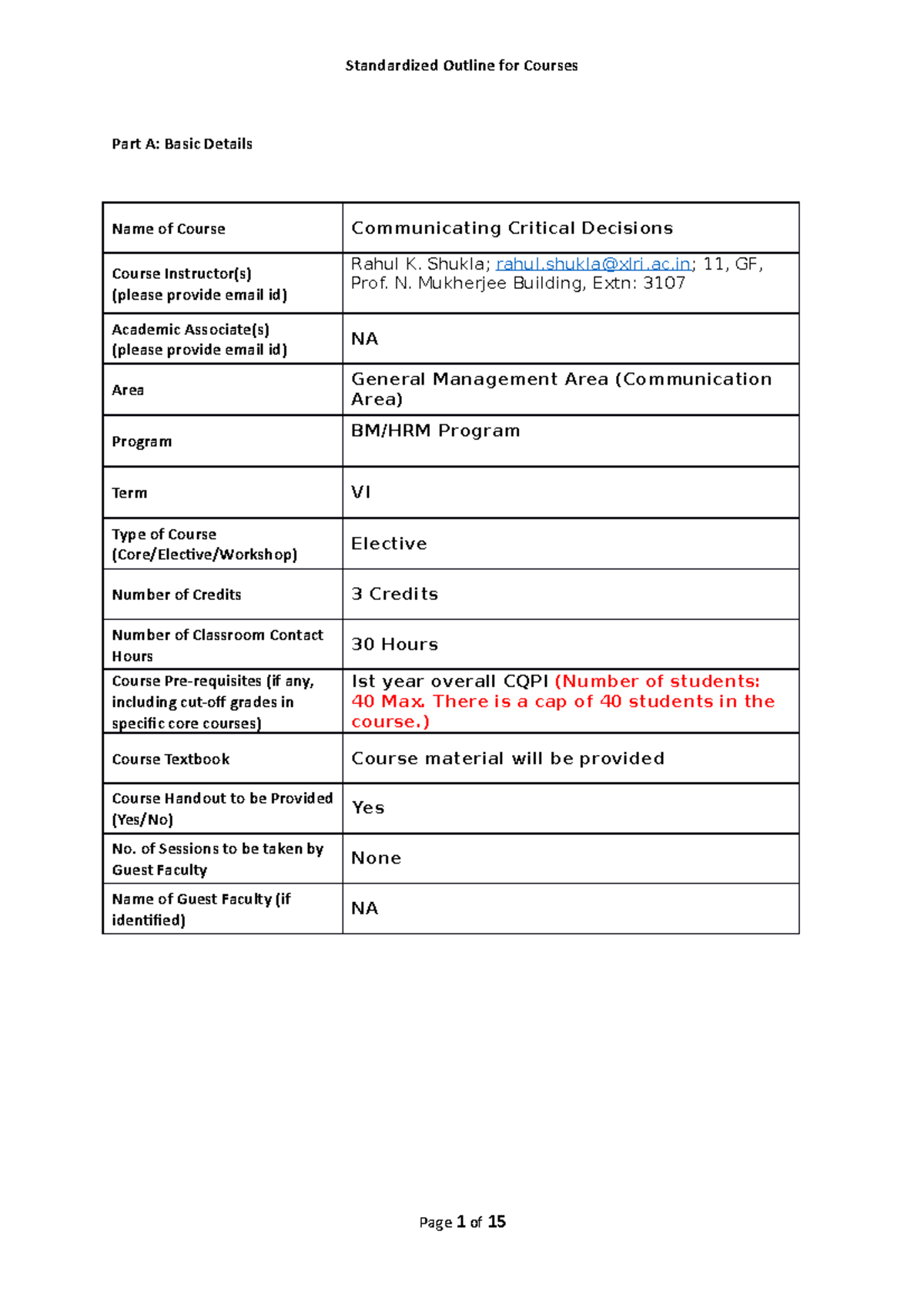 Course Outline CCD VI Term Part A Basic Details Name of Course