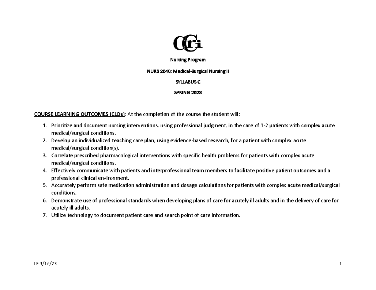 NURS 2040 Syllabus C Session 2 Spring 2023 Nursing Program NURS 2 040