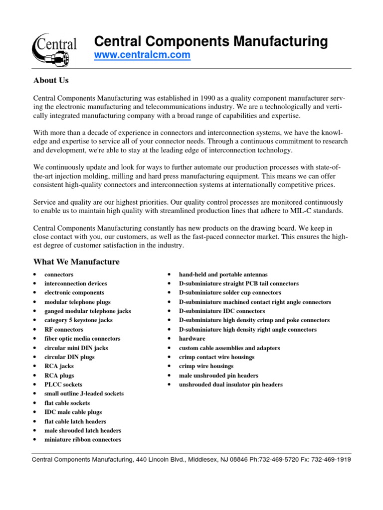 Central Components Mfg. Company Profile Electrical Connector