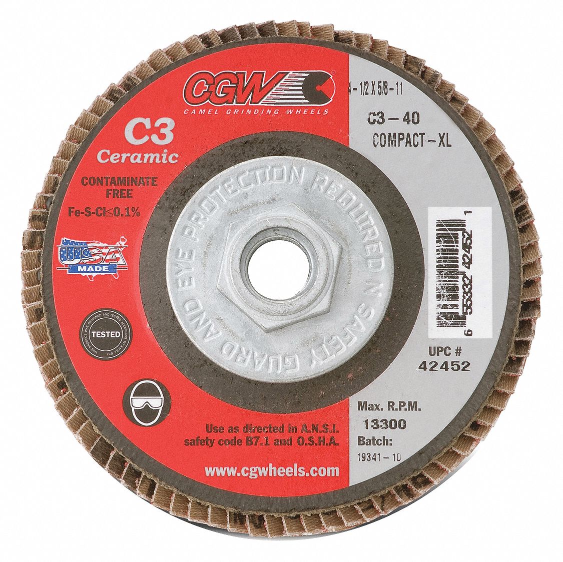 CGW ABRASIVES, Flap Disc,4.5x7/8,C3,Cmpct Cer,XL,40G 267U8442442