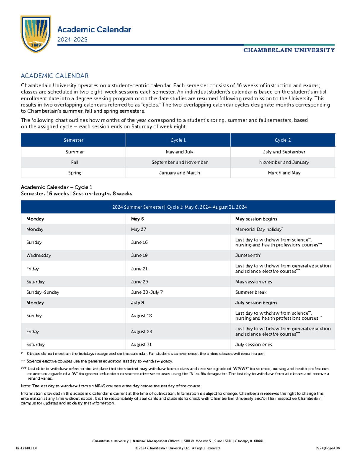 Chamberlain University 20242025 Academic Calendar Overview Studocu