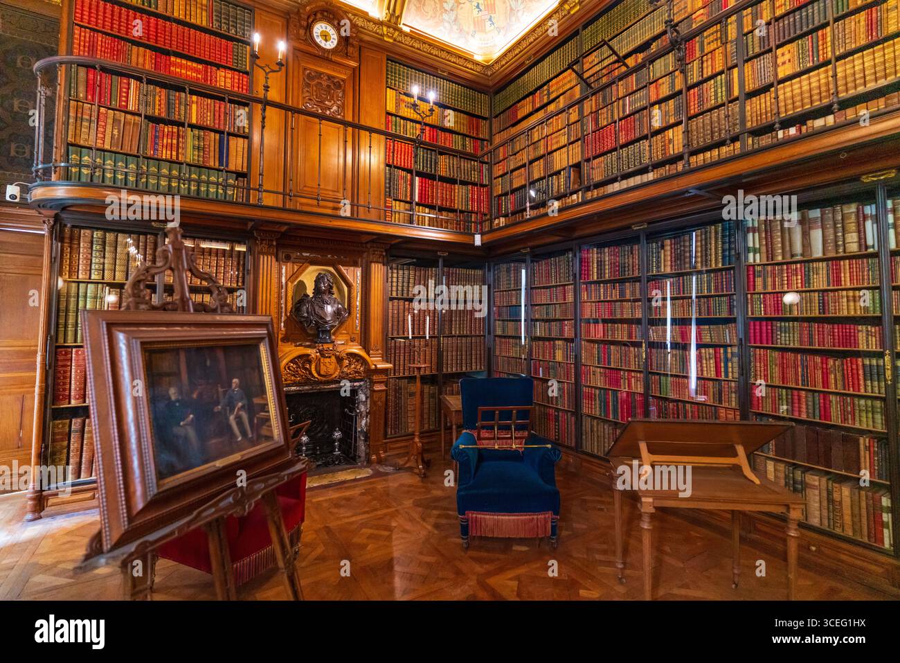 Library of Chateau de Chantilly, a historic castle in Chantilly, France