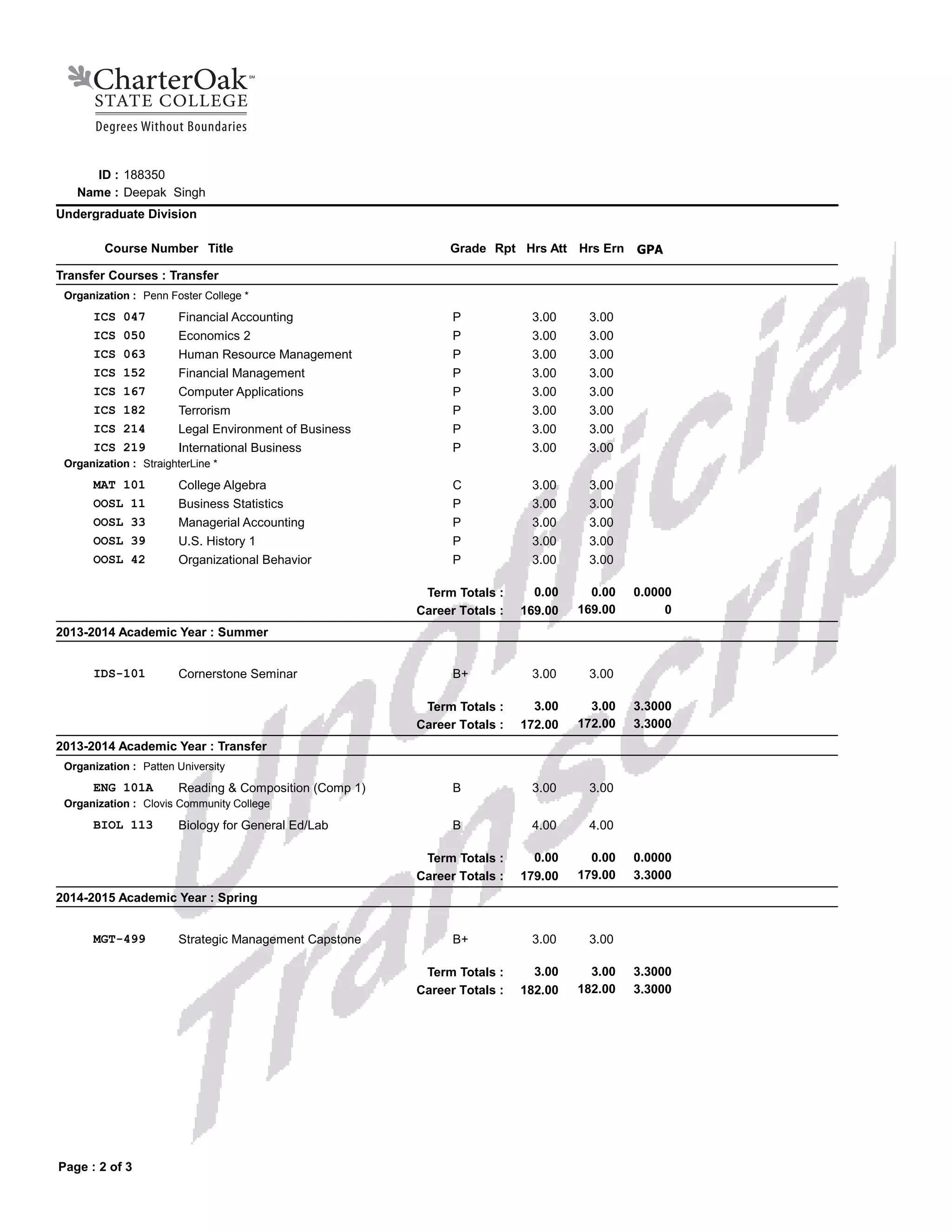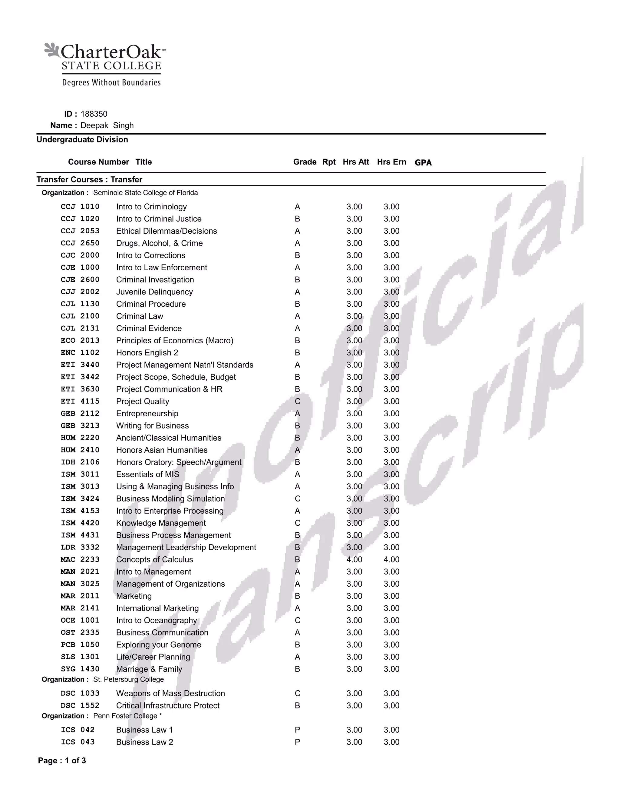 Charter Oak State College Transcript of Deepak Danny Singh PDF