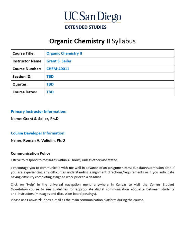 UCSD DES Organic Chemistry II Syllabus CHEM40011 PDF Ester