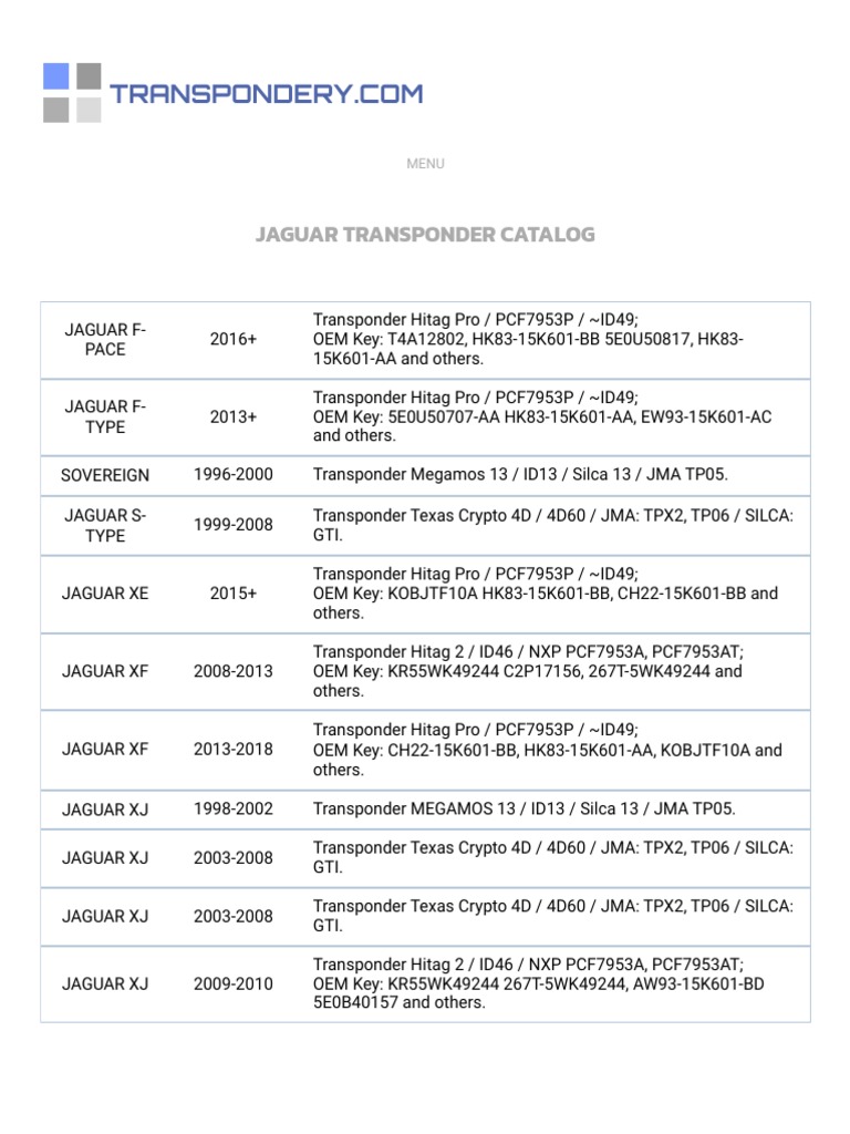 JAGUAR Transponder Chip Catalog Download Free PDF Vehicles Rear