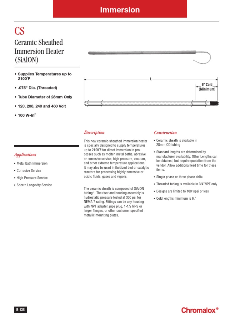 Chromalox Immersion Heater Ceramic Sheathed Immersion Heater (SiAlON