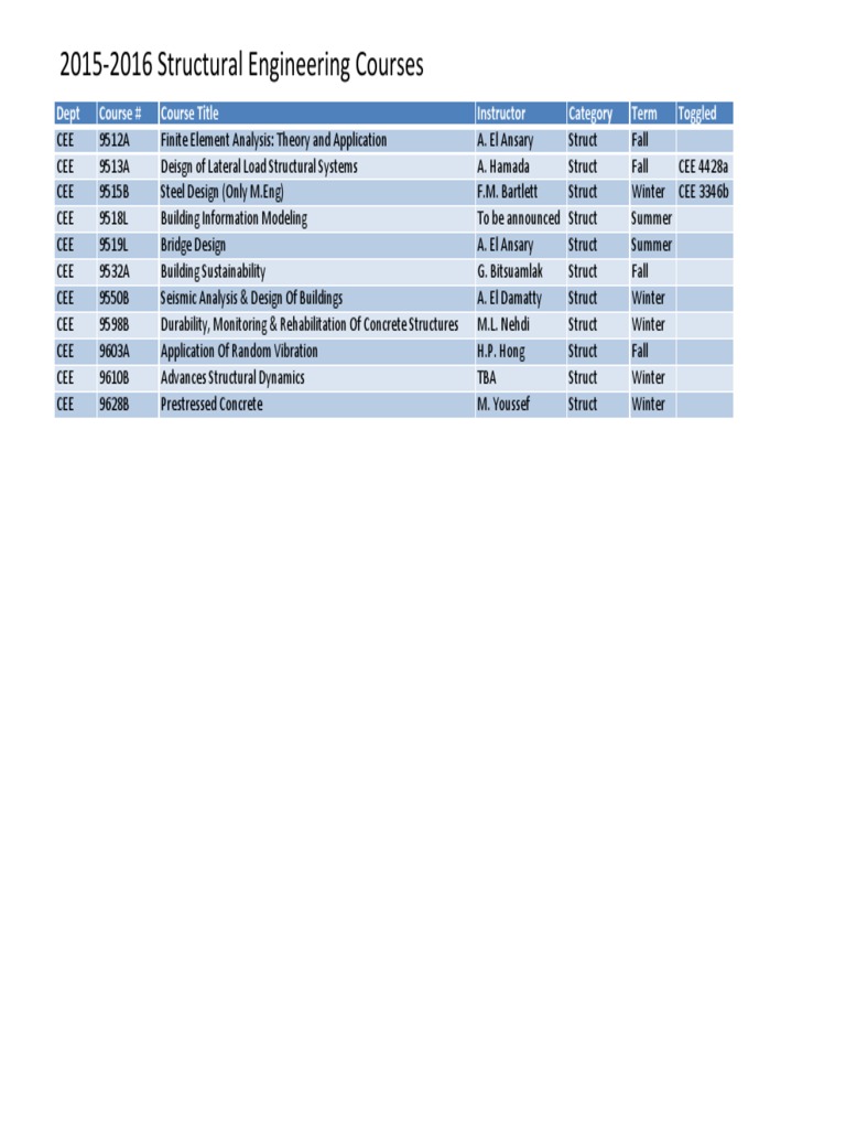 2015 2016 Structural Engineering Courses Dept Course Course Title