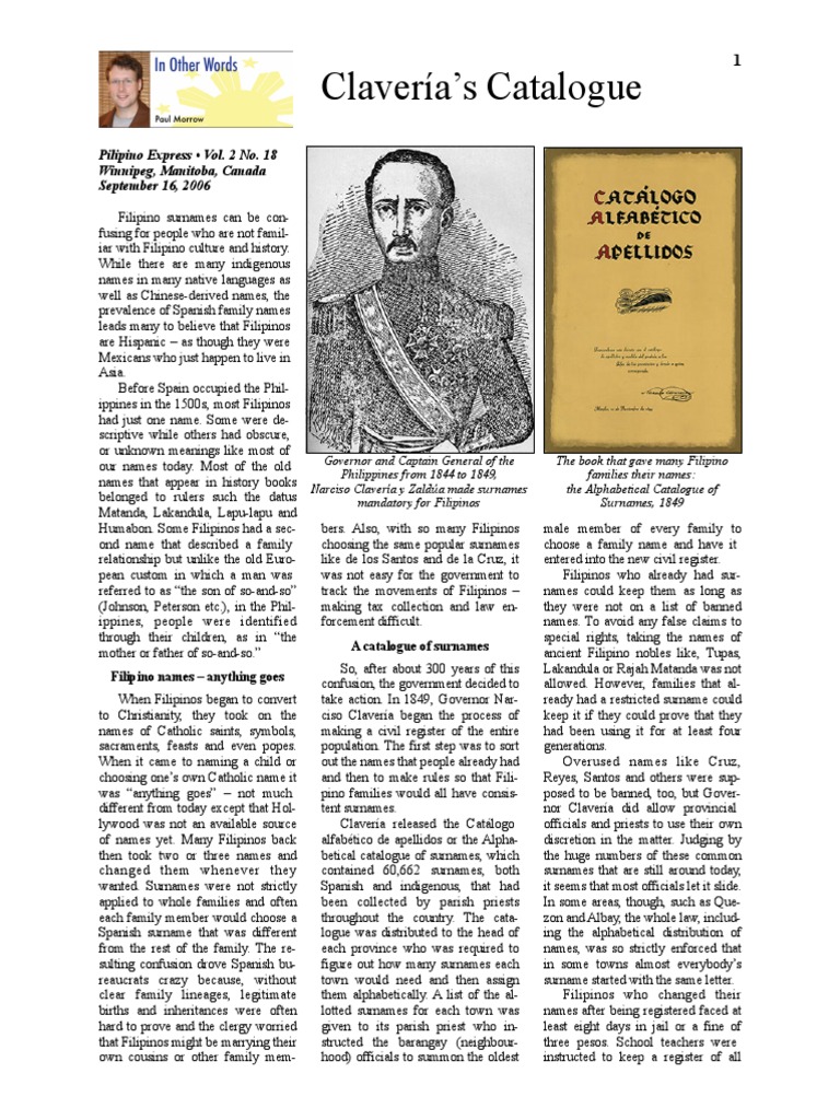 Philippine Genealogy Filipino Surnames and the Claveria catalogue FYLPRO