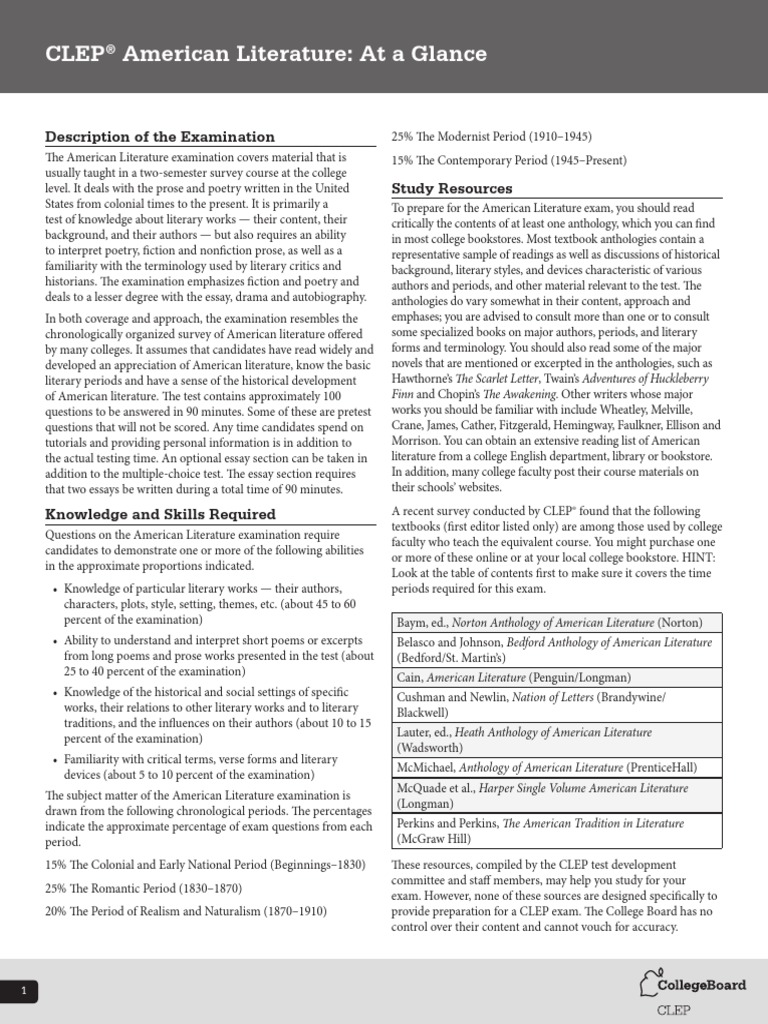 Clep American Literature at A Glance Description of The Examination
