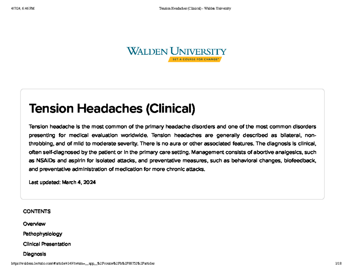 Tension Headaches (Clinical) Walden University Tension Headaches